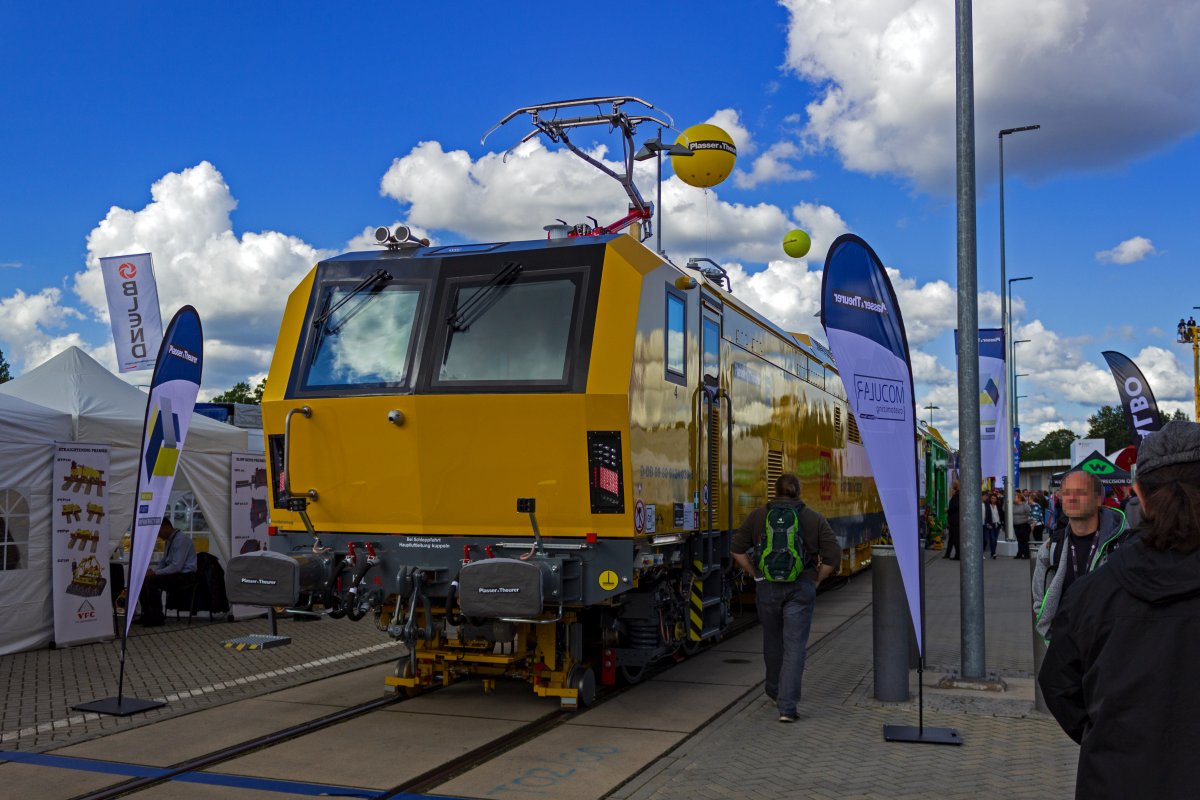 Im Bahnbaubereich stellen nach wie vor dieselbetriebene Arbeitsfahrzeuge den Großteil der Fahrzeugflotte. Plasser&Theurer war auf der InnoTrans 2022 mit einer Unimat Dynamic E3 Stopfmaschine vertreten, die von Elektromotoren angetrieben wird und nur als Rückfallebene einen Dieselmotor besitzt. Der Maschinenwagen mit dem erkennbaren Stromabnehmer ist im Bild zu sehen, während die eigentliche Stopfmaschine im zweiten Wagenteil untergebracht ist. Leon Rosendahl