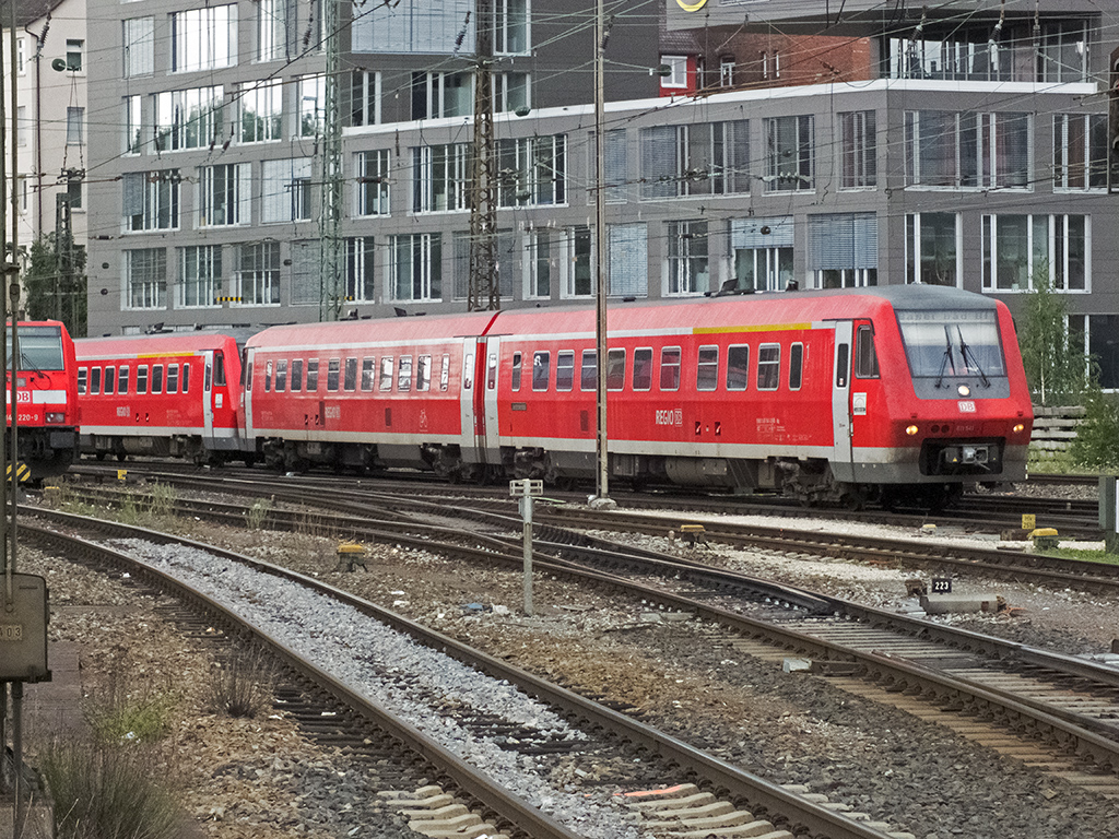 611 005 und ein weiterer VT611 verlassen hier am Vormittag des 31.7.13 den Bahnhof Singen (Hohentwiel) in Richtung Schaffhausen. Normalerweise fahren diese IREs durch bis Basel, aktuell ist der Streckenabschnitt Schaffhausen-Erzingen aber wegen Bauarbeiten zur Elektrifizierung gesperrt.