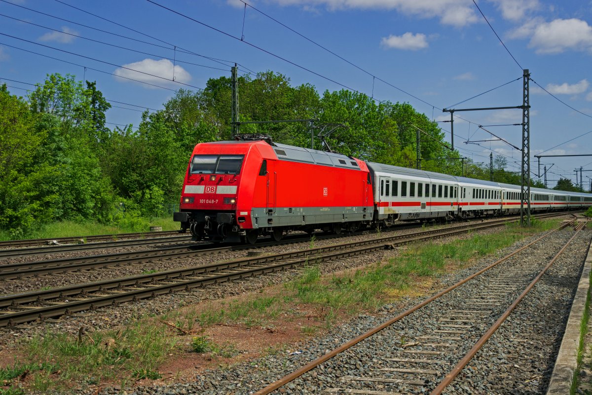 Auf dem Gegengleis ist am 17.05.23 101 048 mit einem InterCity in Richtung Amsterdam unterwegs. Der Zug hat kurz vor dem Bahnhof Niederndodeleben einen Güterzug überholt und wird wahrscheinlich bei der nächsten Gelegenheit wieder ins Regelgleis wechseln.