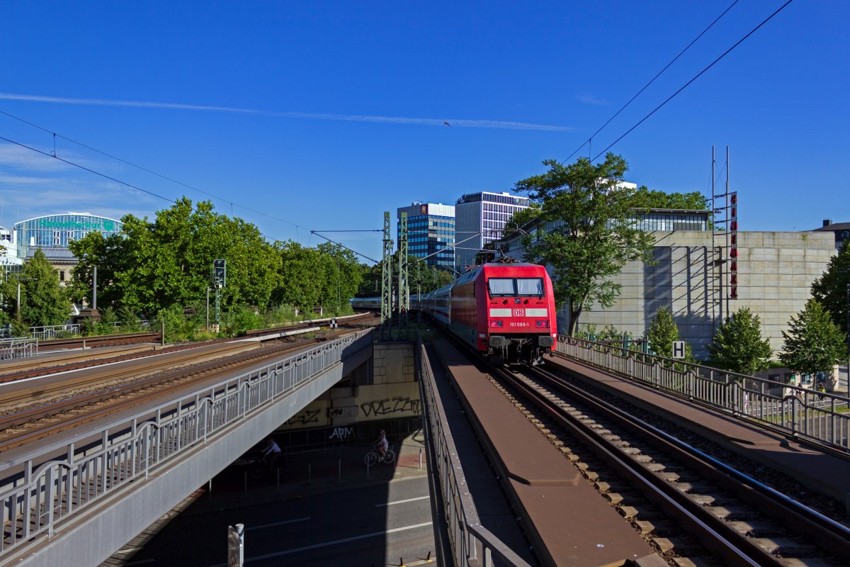 Dieser von 101 089 geschobene InterCity hat am 05.08.2020 den Großteil der Fahrt noch vor sich, seit dem Start in Hamburg-Altona sind erst wenige Kilometer zurückgelegt worden. Vermutlich handelt es sich um den leicht verspäteten IC 2321, der über Bremen und das Ruhrgebiet nach Frankfurt (Main) unterwegs ist.