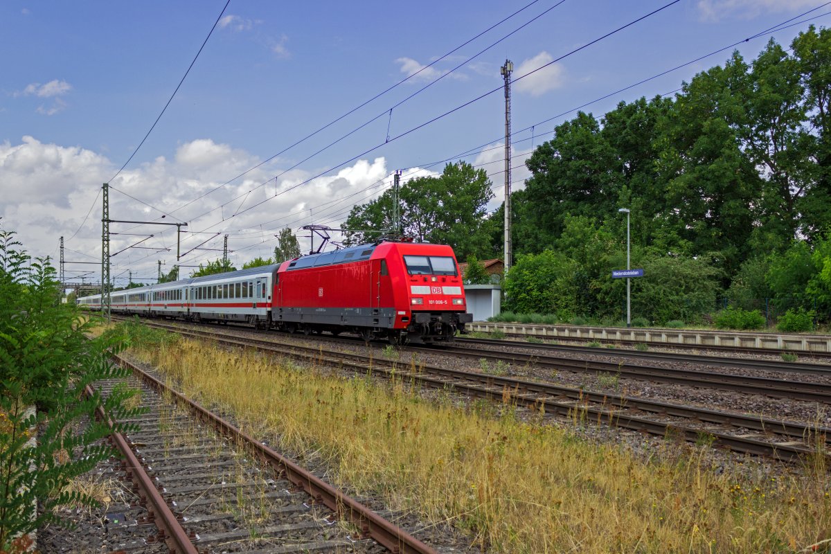 Wegen Bauarbeiten an der Schnellfahrstrecke zwischen Stendal und Berlin wird ein Teil der IC von Berlin nach Amsterdam über Magdeburg und Braunschweig umgeleitet. Mit einem solchen Zug ist 101 006 am 21.07.2022 in Niederndodeleben unterwegs in die Hauptstadt.