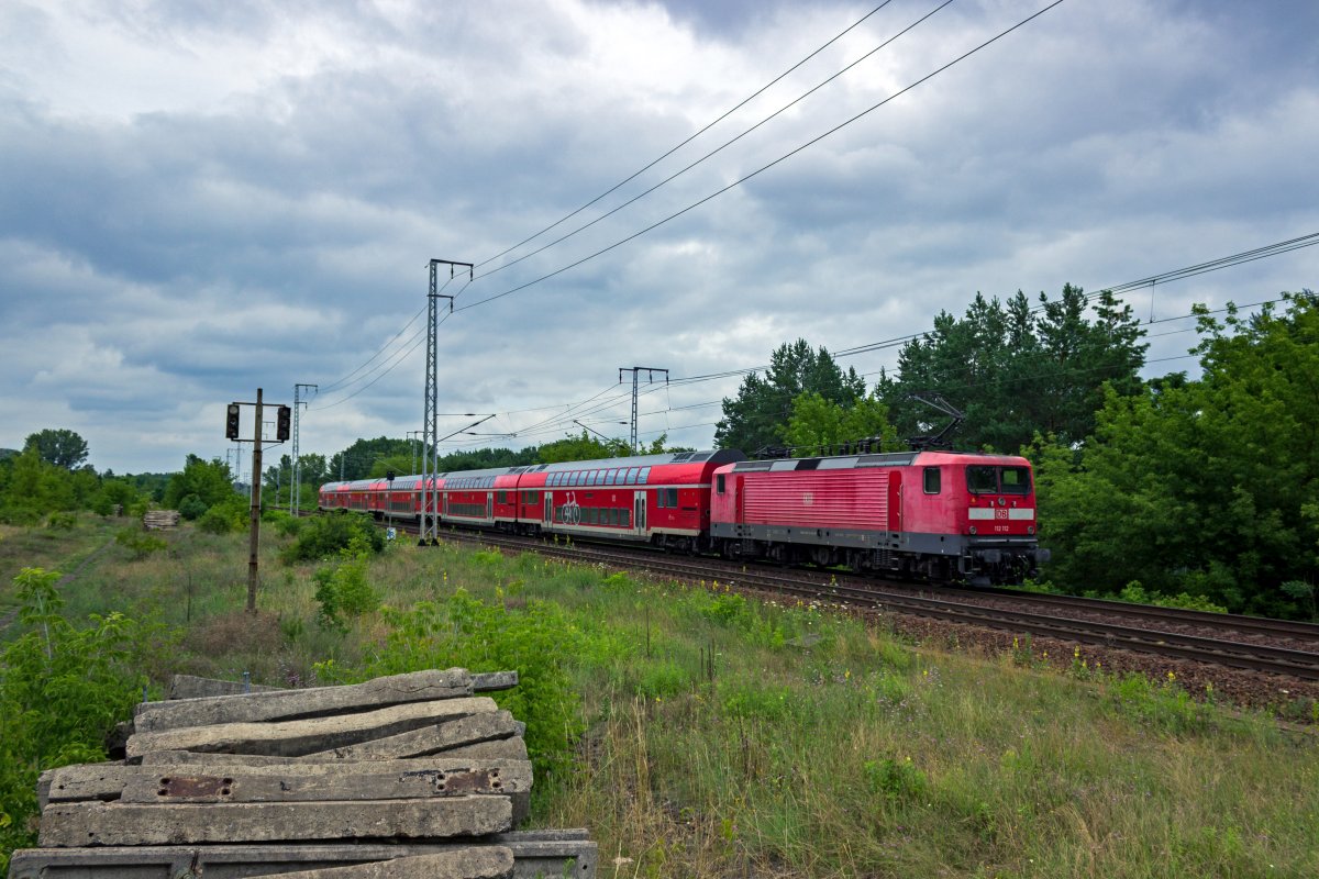Nein, das ist kein Kurzzug auf dem RE1, sondern eine Überführungsfahrt. Vermutlich aus Cottbus kommend durchfährt 112 124 mit einem Doppelstock-Steuerwagen den Bahnhof Erkner.