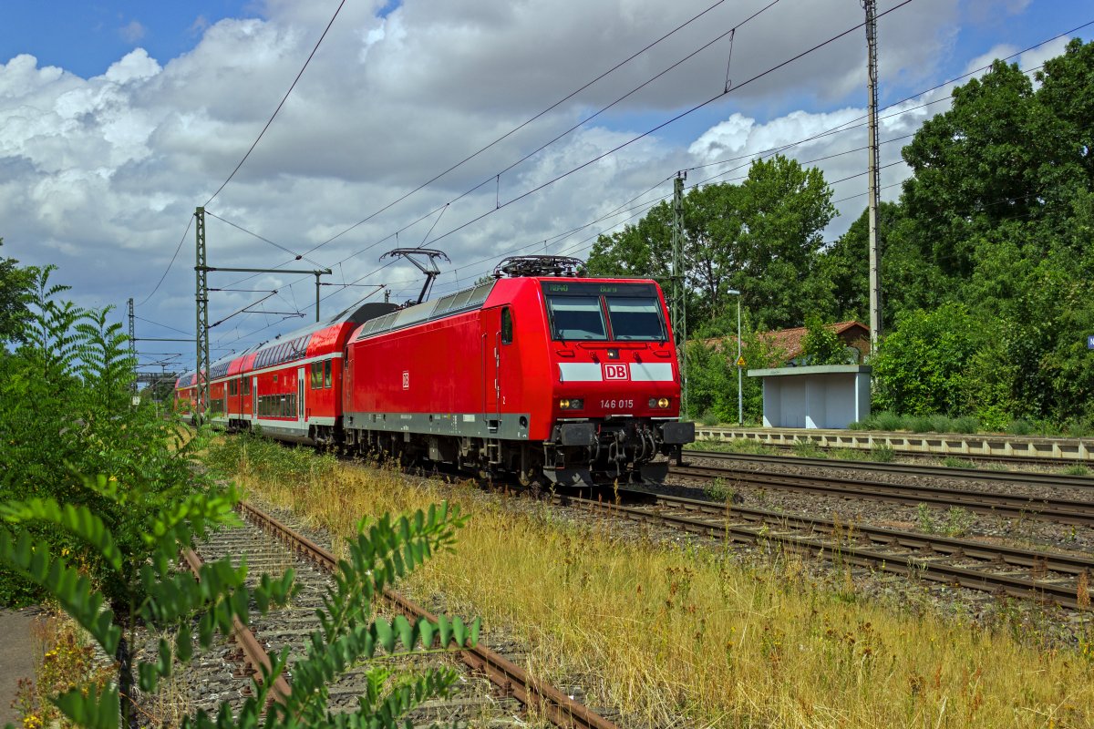 Auf der Fahrt von Magdeburg nach Braunschweig erreicht diese Regionalbahn mit 146 016 als Schublok Niederndodeleben.