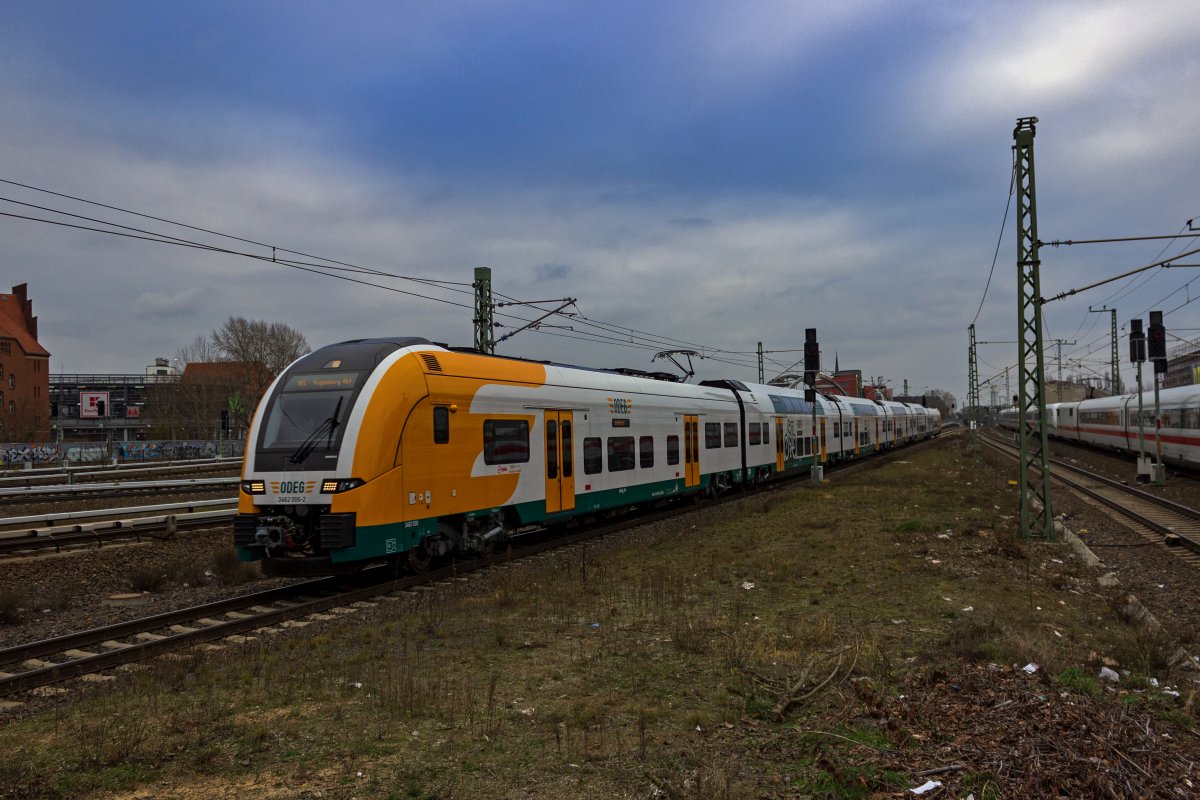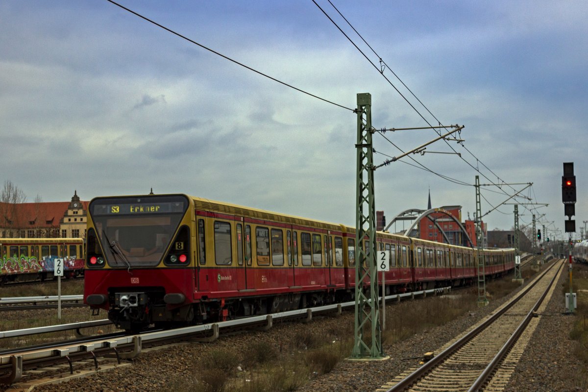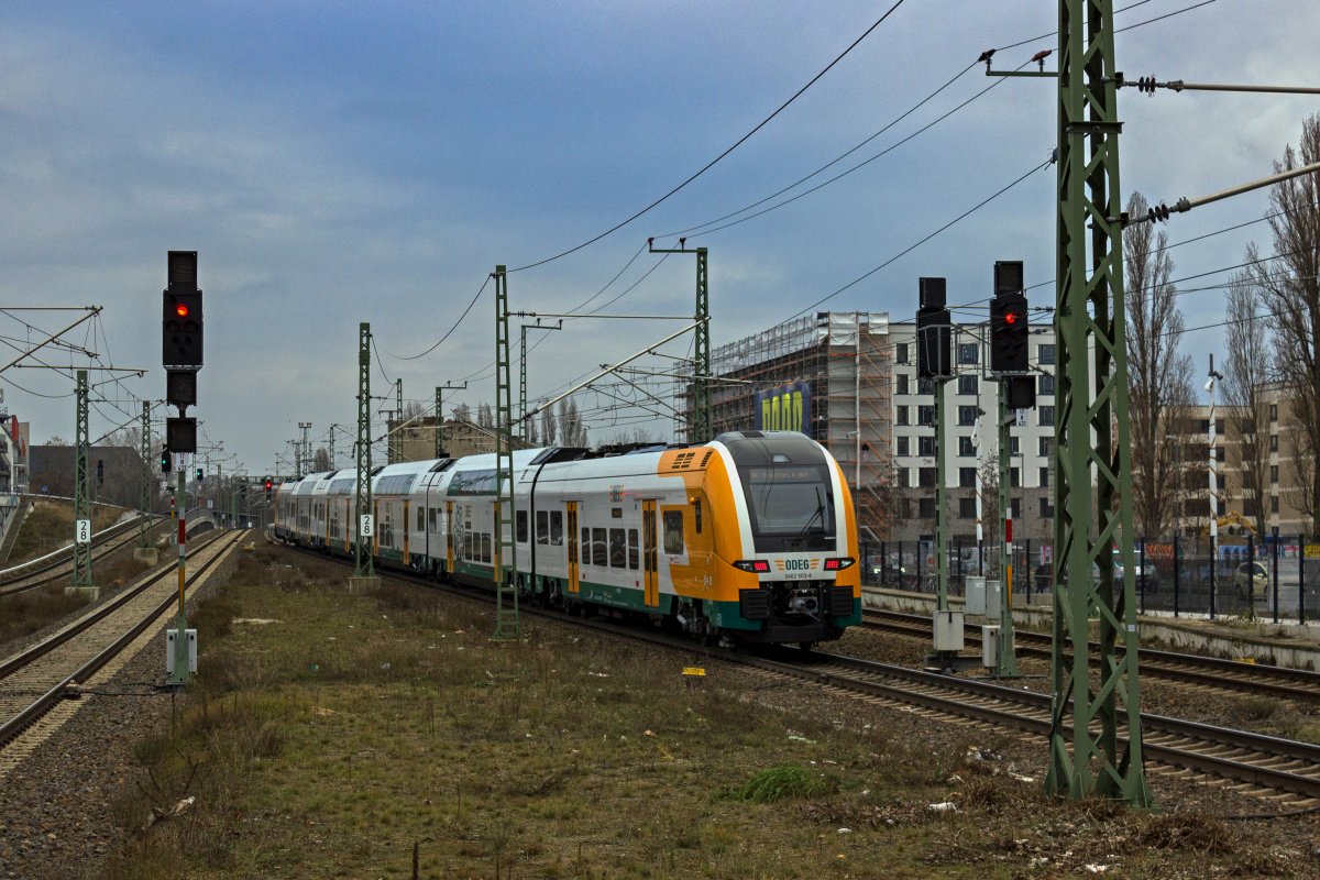 Während im Hintergrund ein ICE 2 auf die Weiterfahrt zum Ostbahnhof wartet, fährt ein 480-Vollzug in Richtung Friedrichshagen aus. Seit kurzem stehen am Regionalbahnsteig Berlin-Ostkreuz recht ungewöhnliche Haltetafeln, die die Halteposition für 212 Meter lange Züge anzeigen. Der Hintergrund ist, dass dies die genaue Länge eines doppelten vierteiligen Desiro HC der ODEG ist, der Bahnsteig allerdings nur etwa 210 Meter lang ist. Etwa zwei Meter hinter dem Bahnsteigende wurden also die Haltetafeln aufgestellt.