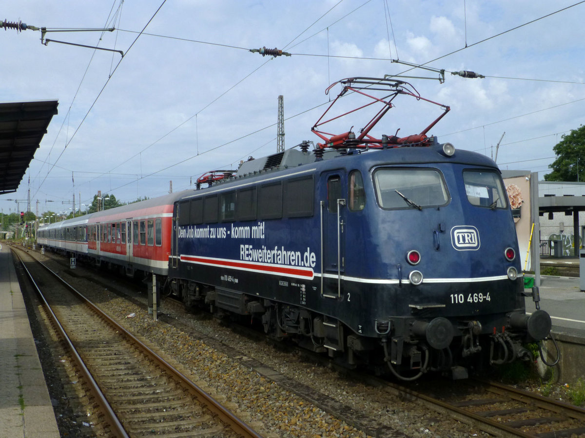Eine n-Wagen-Garnitur mit einer Lok der Baureihe 218 am Zugschluss fährt am 08.08.2012 in Köln-West ein.