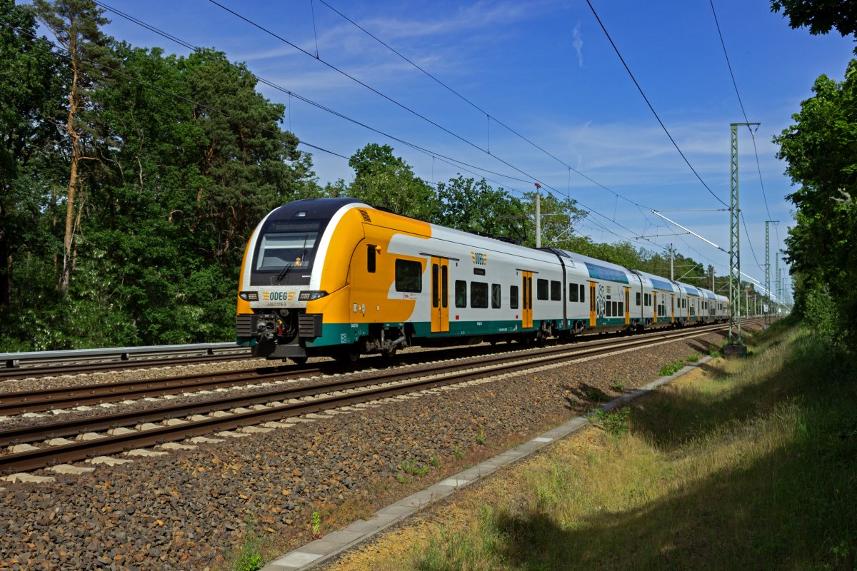 VT646.045 der ODEG passiert am 1.11.13 das verfallende Empfangsgebäude von Michendorf.