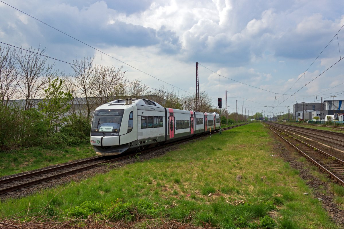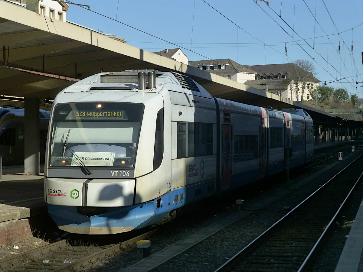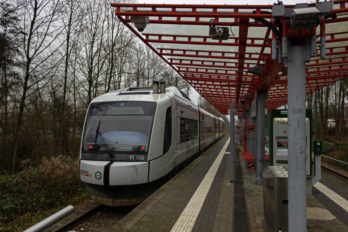 Bereits seit längerer Zeit ist der Fahrzeugpark der Regiobahn für die zu erbringenden Beförderungsleistungen nur gerade so ausreichend; nötige Kapazitätserweiterungen waren kaum möglich. Durch die Verlängerung der Linie S28 nach Wuppertal wurden noch dringender neue Fahrzeuge benötigt, insbesondere, weil die geplante Elektrifizierung der Strecke noch nicht absehbar ist. Auf der Suche nach Fahrzeugen wurde man in Bayern fündig, wo die Bayerische Oberlandbahn soeben ihre "Integral"-Triebwagen durch neue LINT ersetzt hatte. Und so verschlug es diese Konstruktion der österreichischen Jenbacher-Werke, die nur in Form der BOB-Triebwagen je gebaut wurde, nach NRW. Hier hält 609 104 an Heiligabend 2020 im neu errichteten Haltepunkt Hahnenfurth/Düssel und wird ohne dass ein Fahrgastwechsel nötig wäre nach Wuppertal weiterfahren.