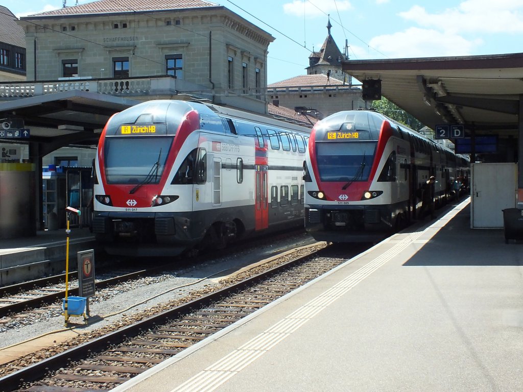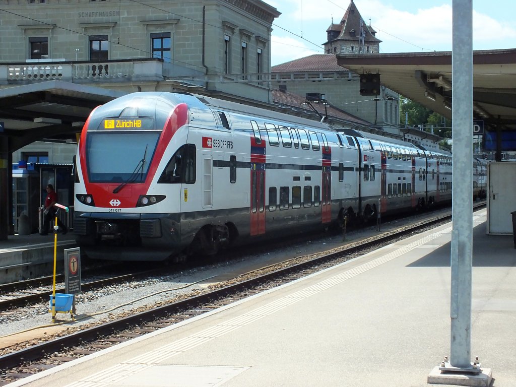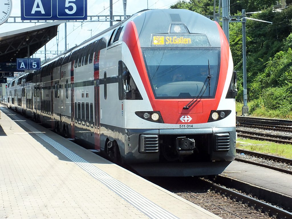 RABe 511 111 fährt am 04.08.14 aus Richtung Zürich in Basel SBB ein. Die KISS-Triebwagen sind in der Schweiz recht unbeliebt, weil mit ihnen auch in IR- und RE-Diensten sämtliche Zugbegleiter eingespart wurden.