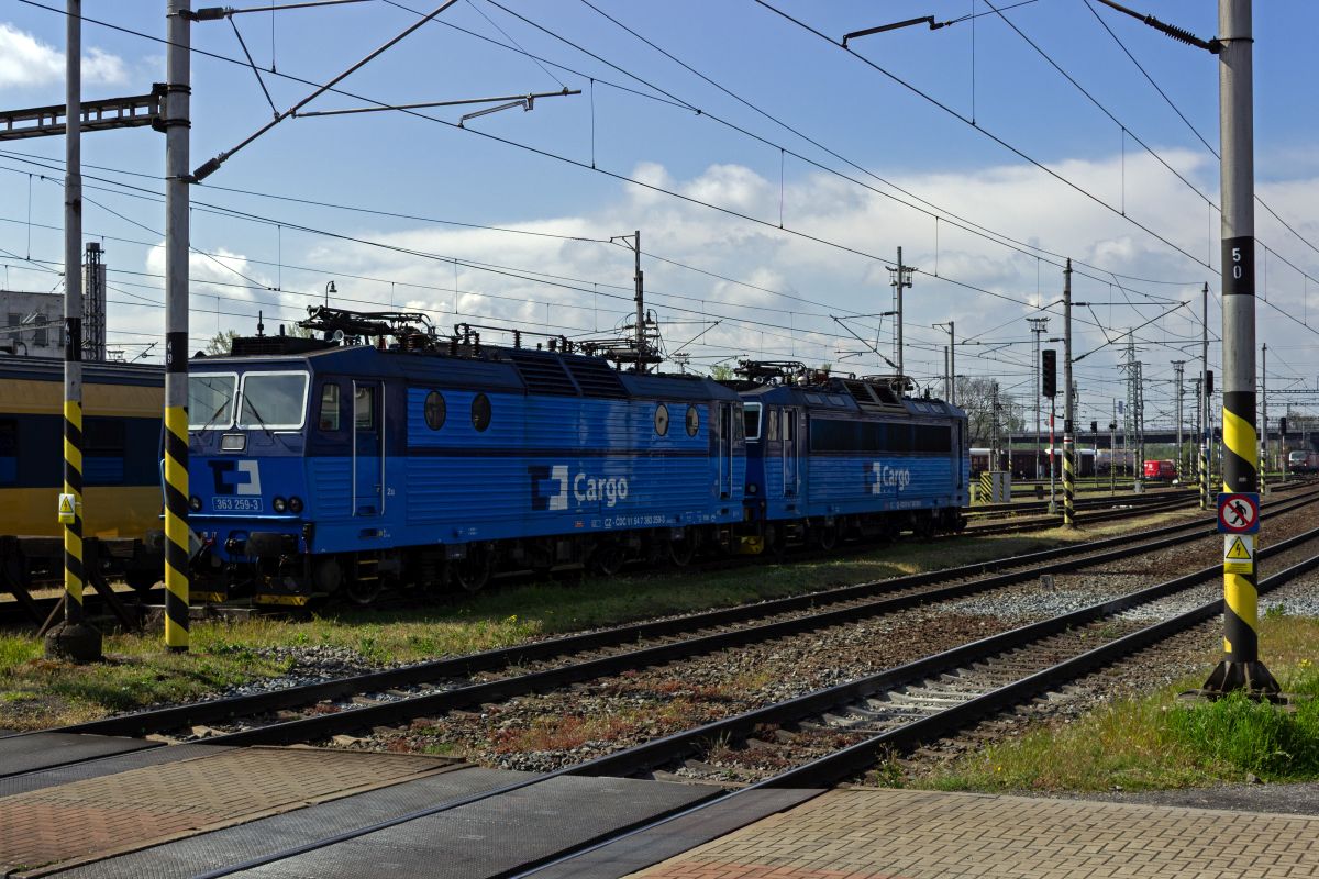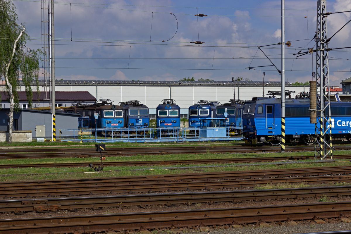 Unmittelbar nördlich des Bahnhofs Ostrava hl.n. liegt das Betriebswerk von ČD Cargo. Am 25.04.24 warteten dort zahlreiche Lokomotiven, unter anderem 363 022, 363 013, 742 454, sowie halb durch ein Stellwerk verdeckt eine Lok im grün/beigen Retrolack auf neue Einsätze.