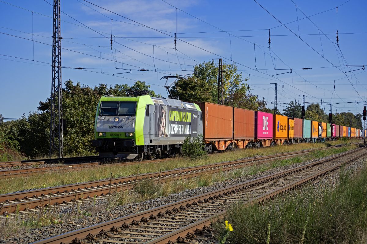 383 410 von METRANS durchfährt mit einem Containerzug den Bahnhof von Saarmund.