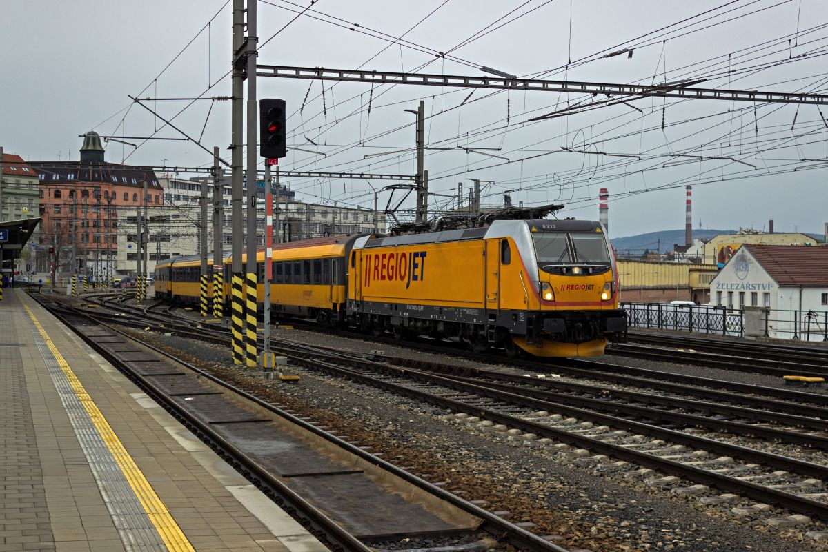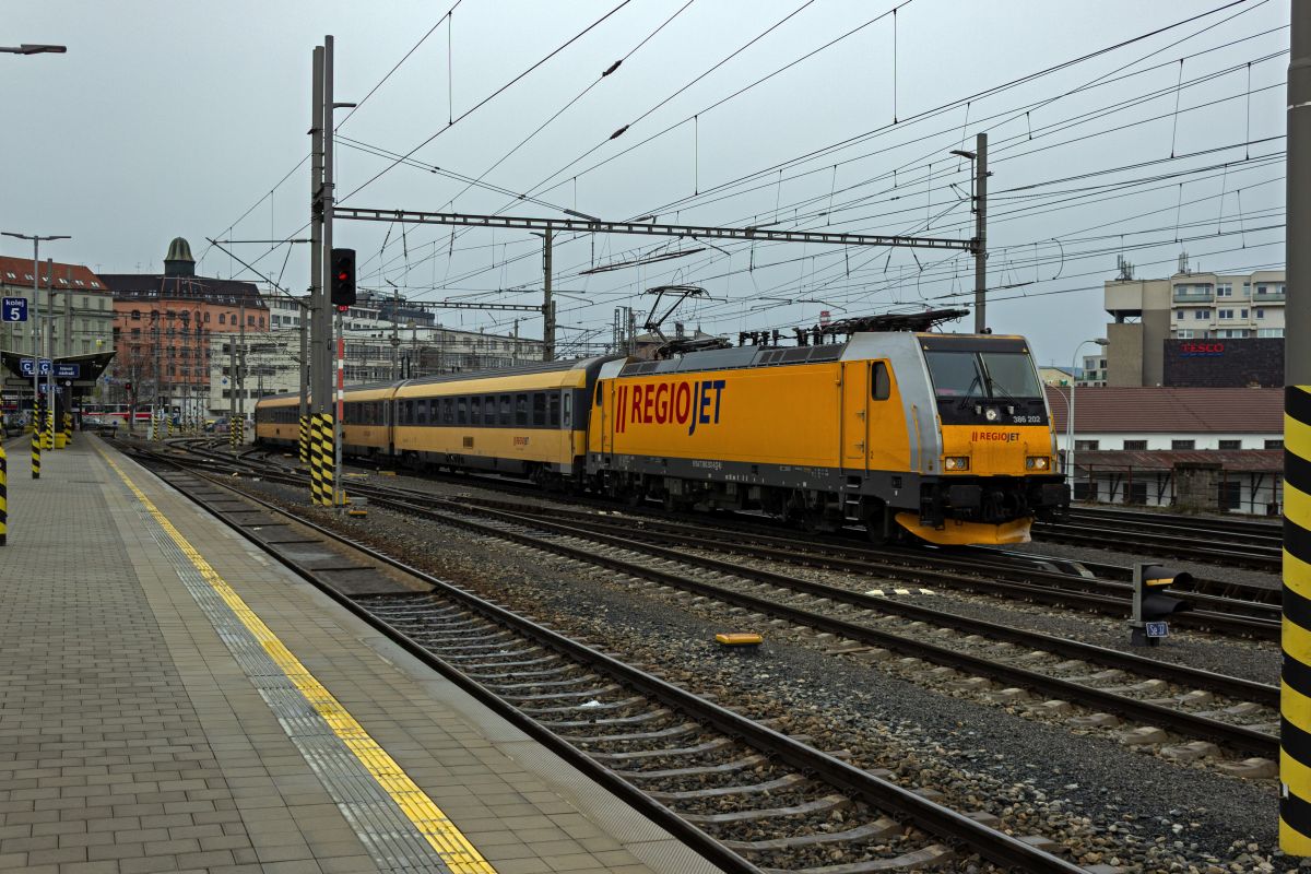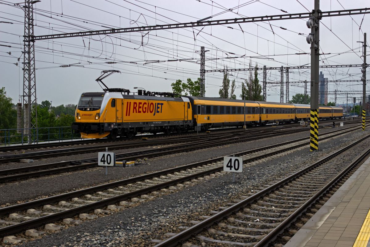 Der Anbieter RegioJet ist mit seinen gelben Zügen in Tschechien und darüber hinaus zu einem bekannten Anblick geworden. Mit dem morgendlichen Zug aus Wien durchfährt die von ELL gemietete 193 214 Praha-Běchovice.