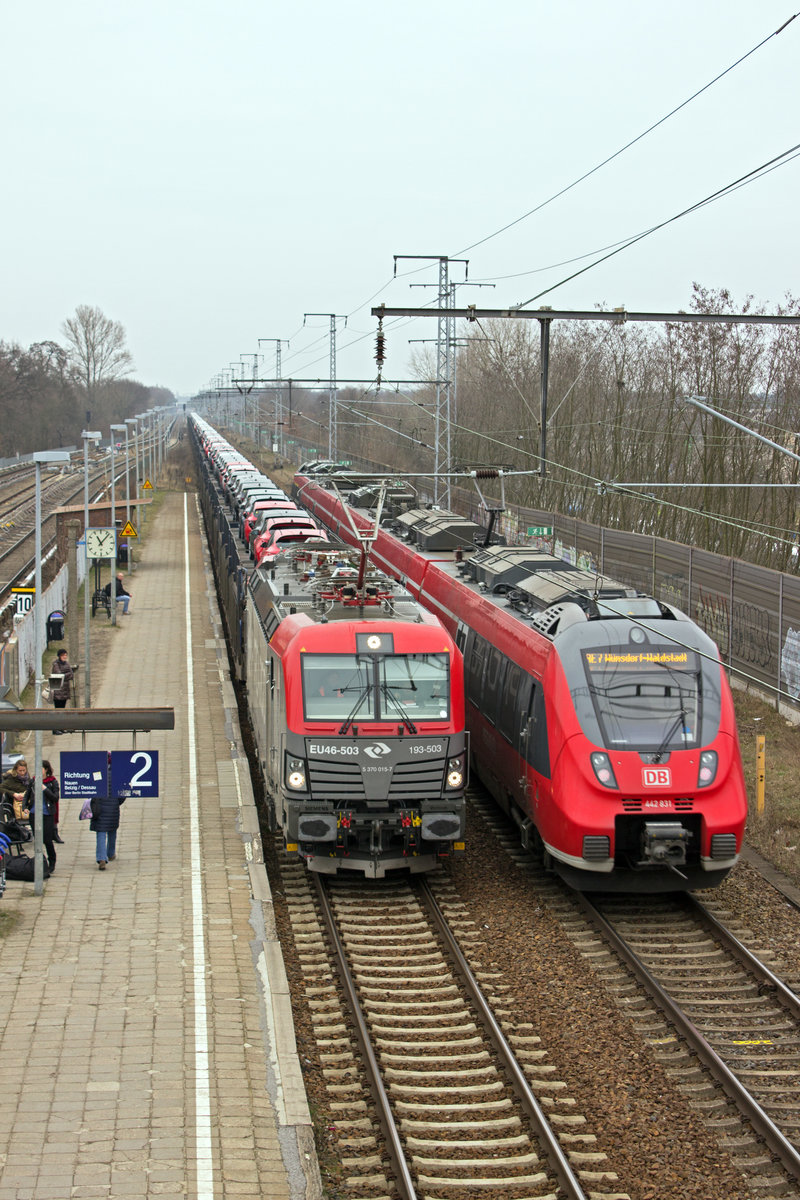 Nachschuss auf 193 503 mit einem S-Bahn-Zug nach Erkner im Hintergrund.