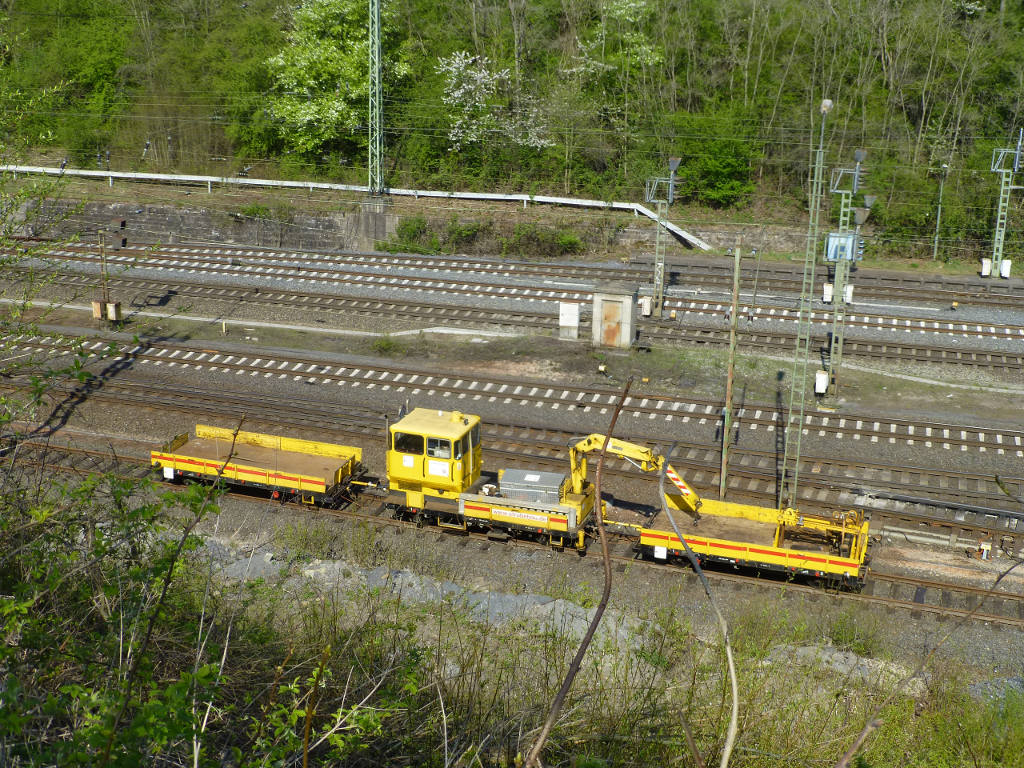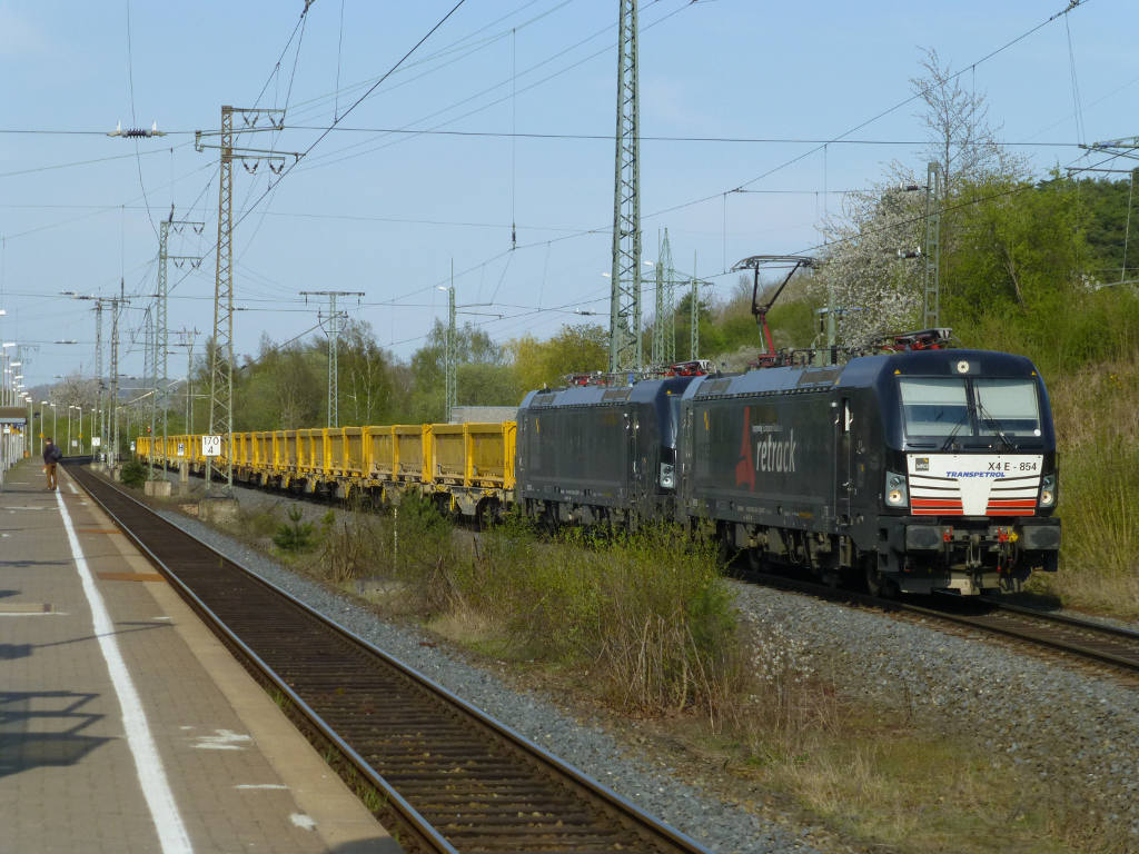 X4E-854 (und das Schwestervektron) fährt für DB Fahrwegdienste und steht daher am Bahnhof Eichenberg mit einem leeren Abraumganzzug der Großbaustelle Stuttgart 21, 24.4.15 Alanya Du Rouen