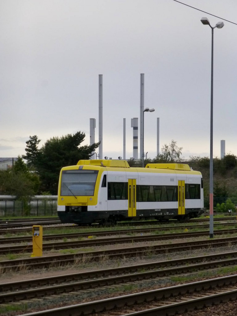 VT 306 der EB wartet vor der Werkstatt auf ein Signal zur Ausfahrt, laut Beschilderung wird er im Anschluss nach Leipzig fahren, 1.9.15. Alanya Du Rouen