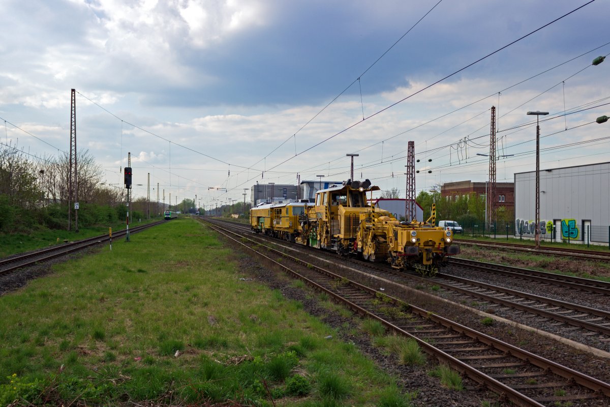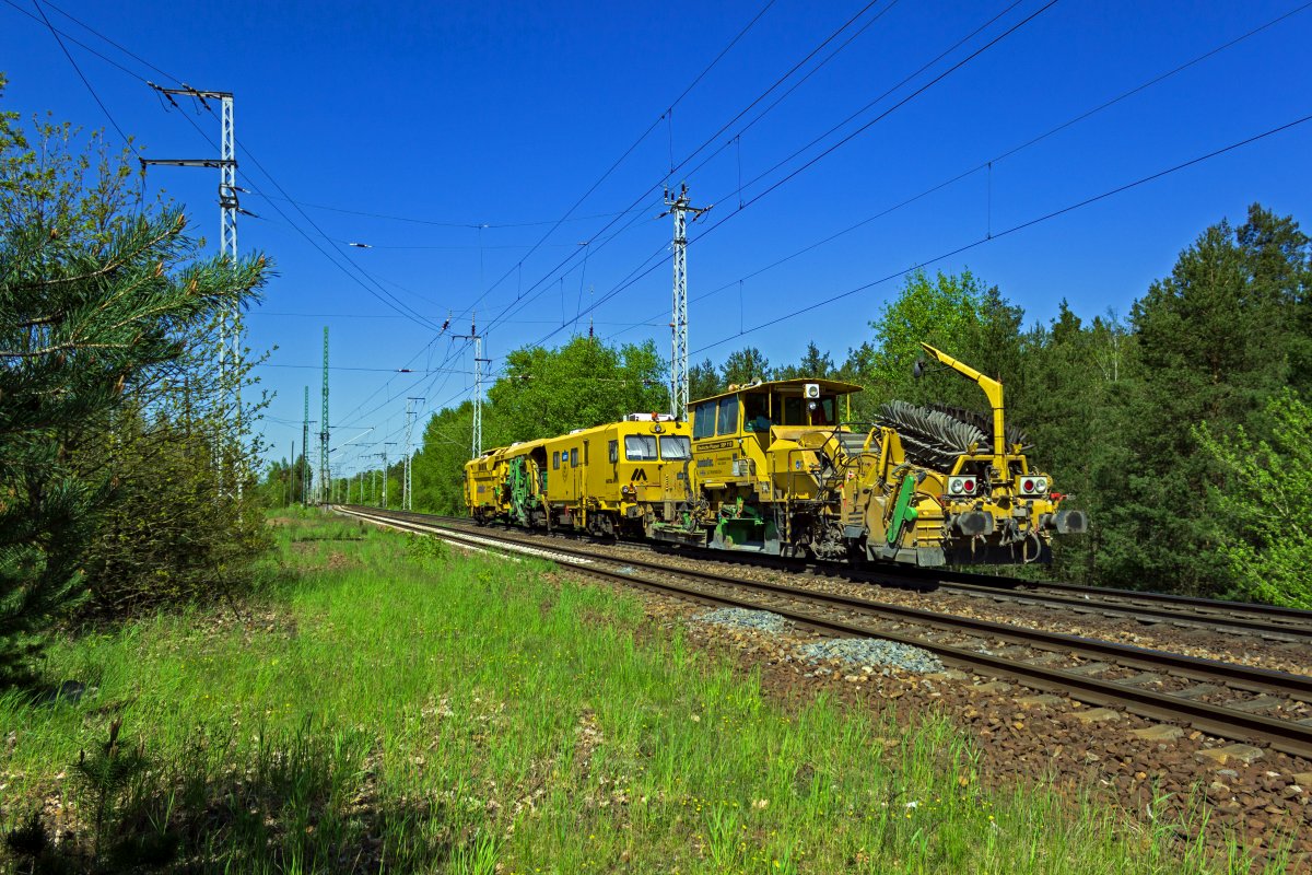 Eine Bettungsreinigungsmaschine und eine Stopfmaschine sind am 08.05.23 etwas nördlich des S-Bahnhofs Wuhlheide auf dem Berliner Außenring unterwegs. Leon Rosendahl