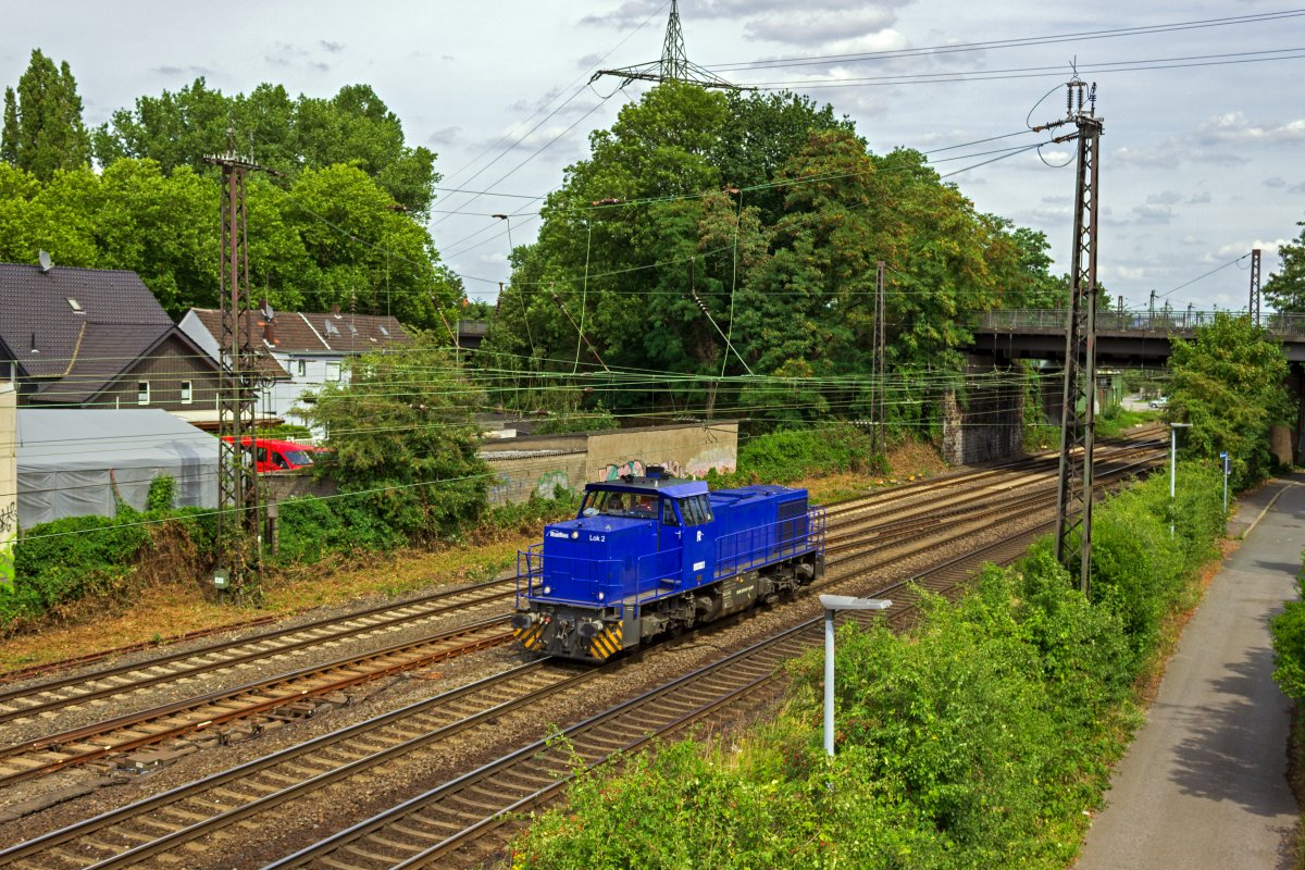 Selbstentladewagen, die mit einer dicken Schicht weißem Staub bedeckt sind, kommen im westlichen Ruhrgebiet höchstwahrscheinlich vom Kalkwerk in Wülfrath. Lok 3 von Railflex (92 80 1275 814) hat am 28.07.23 einen beladenen Kalkzug bis Oberhausen-Osterfeld zu befördern, wo die Wagen für den Weitertransport vorbereitet werden.