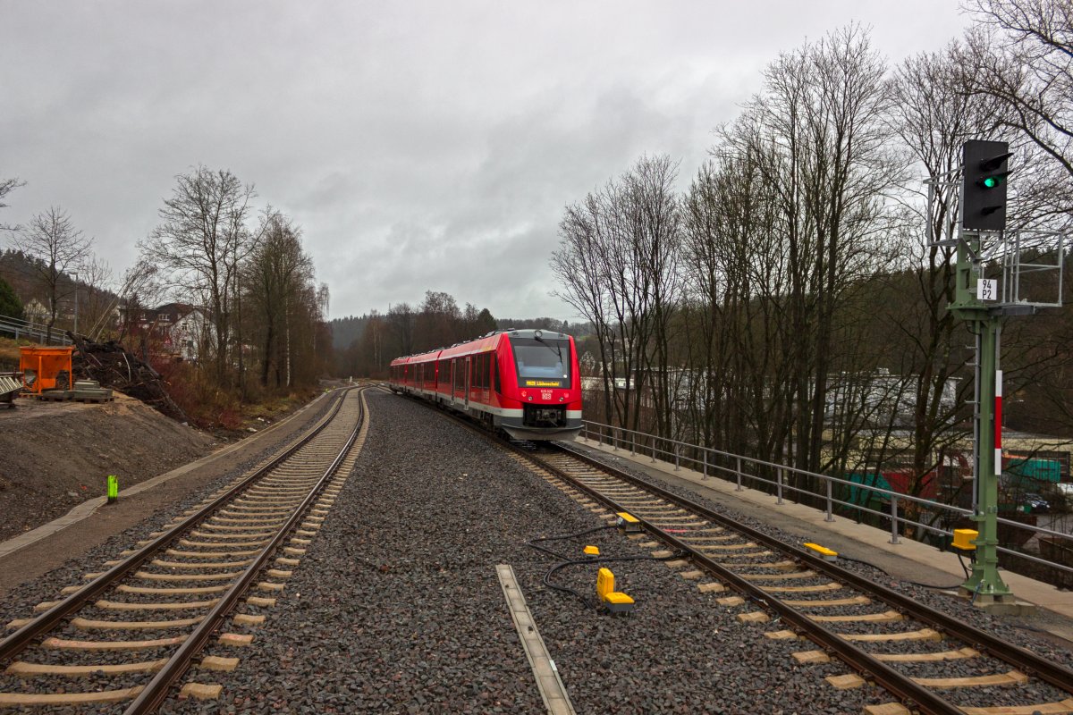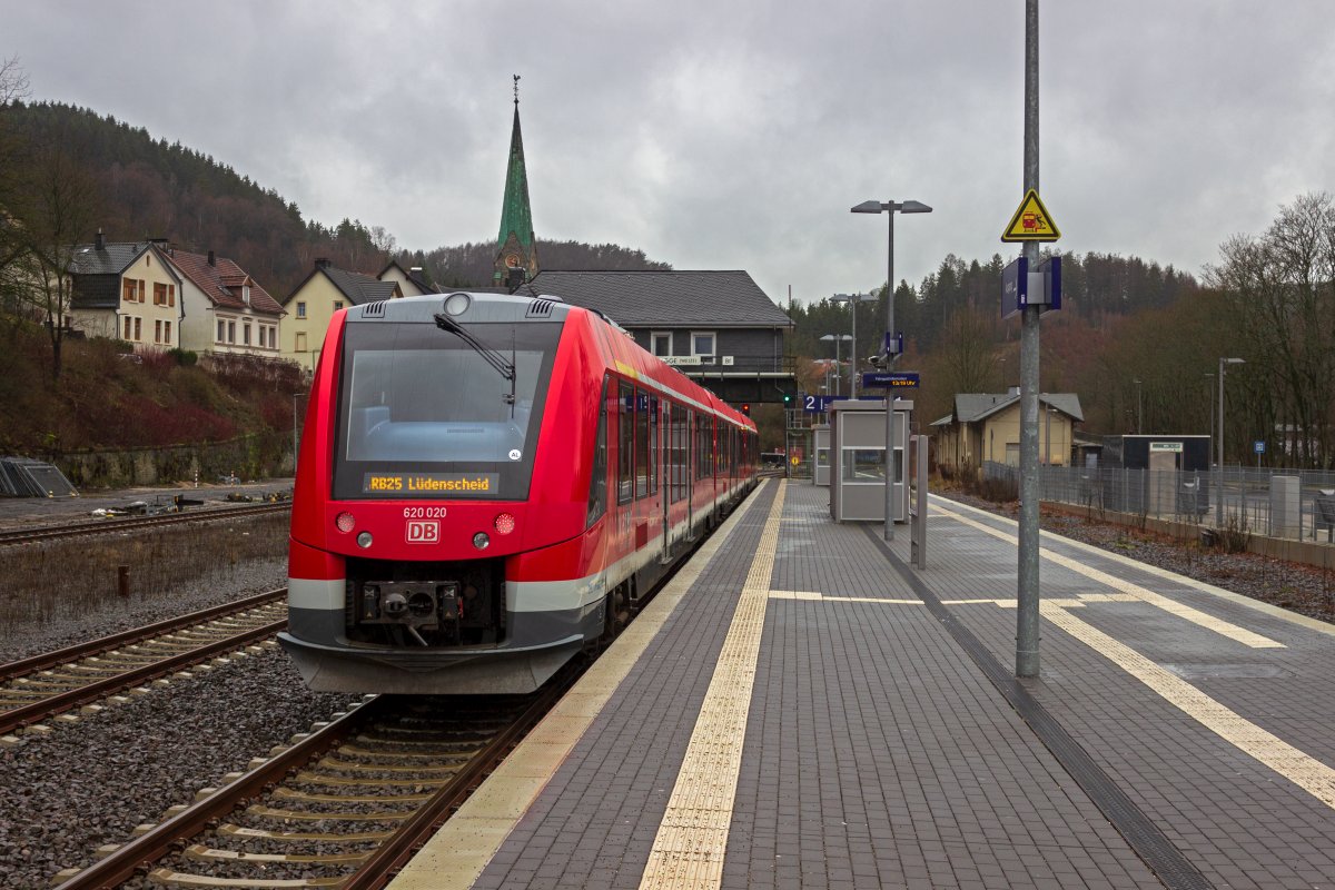 Der Bahnsteig in Kierspe ist lang genug, um mit einer Doppeltraktion vareo-LINT bedient zu werden. Am 24.12.19 kreuzen sich dort 620 016 und 620 020.