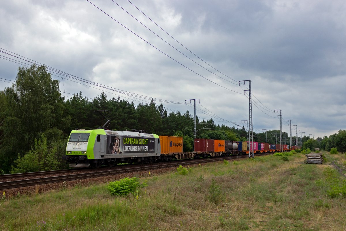 Die 185 548 von Captrain durchfährt mit einem sehr gut ausgelasteten Containerzug den Bahnhof von Saarmund in Richtung Westen.