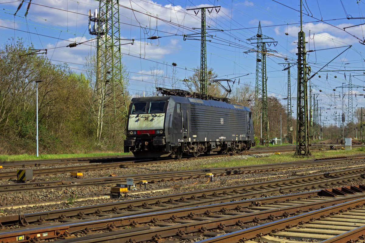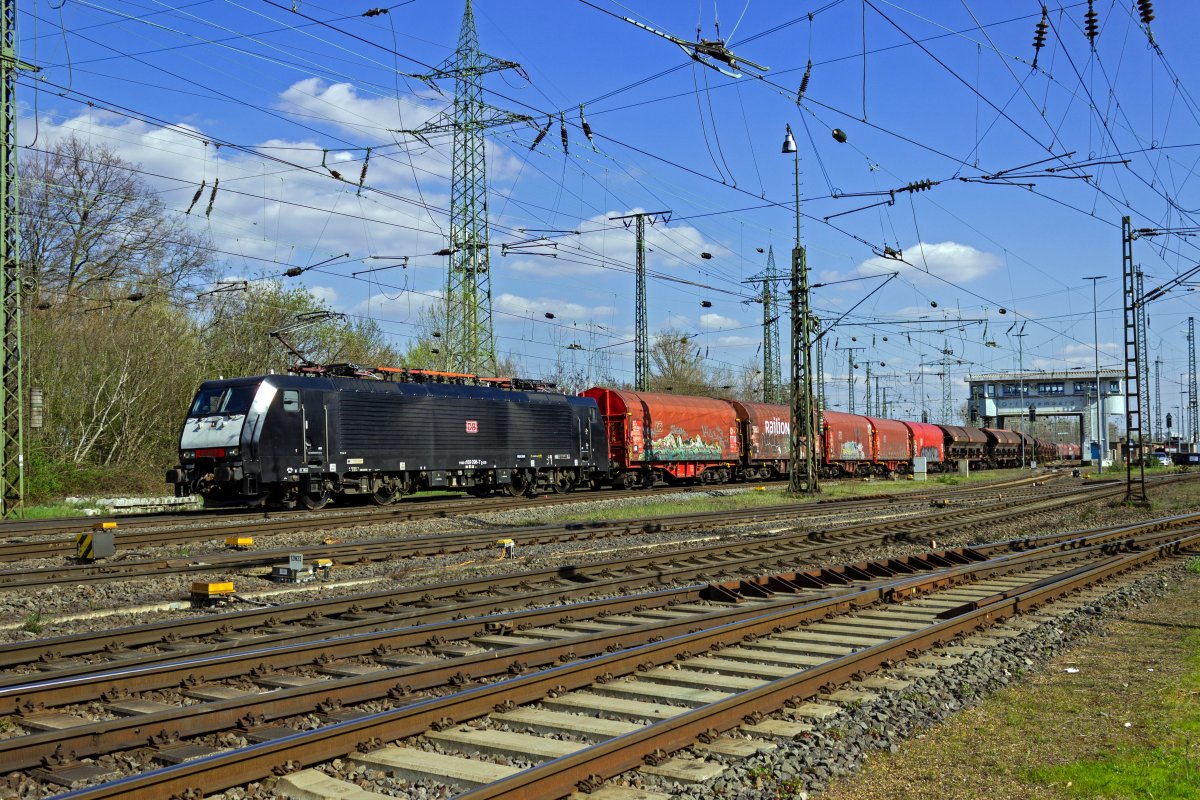 Als Zuglok eines gemischten Güterzugs ist 189 003 in Niederndodeleben auf dem Weg in Richtung Magdeburg.