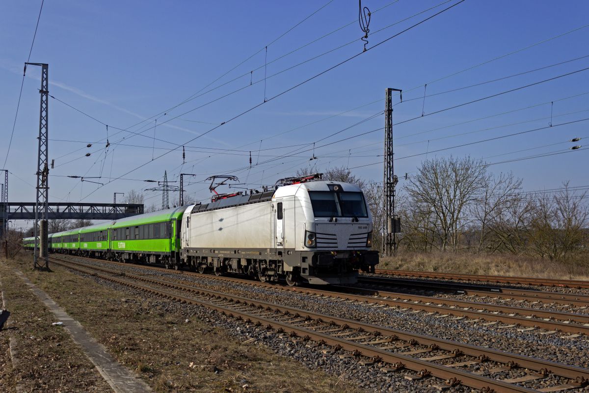 Flixtrain gehört zu den Unternehmen, die neu gelieferte Loks recht lange im neutralen weißen Lack einsetzen. Die im Sommer 2024 ausgelieferte 193 449 war am 10.03.25 noch in neutralen Farben unterwegs, mittlerweile ist die Lok mit grünen Folien optisch den Wagen angeglichen worden. Leon Rosendahl