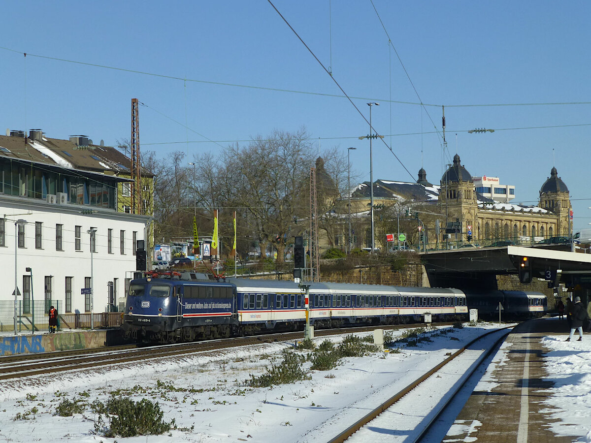 Mit der "normalen" National-Express-Ersatzgarnitur ist am 12. Februar 2021 der RE7 unterwegs, hier bei der Durchfahrt in Steinbeck, vorne die Lok 110 469 im National-Express-Design und mit Jobwerbung.
