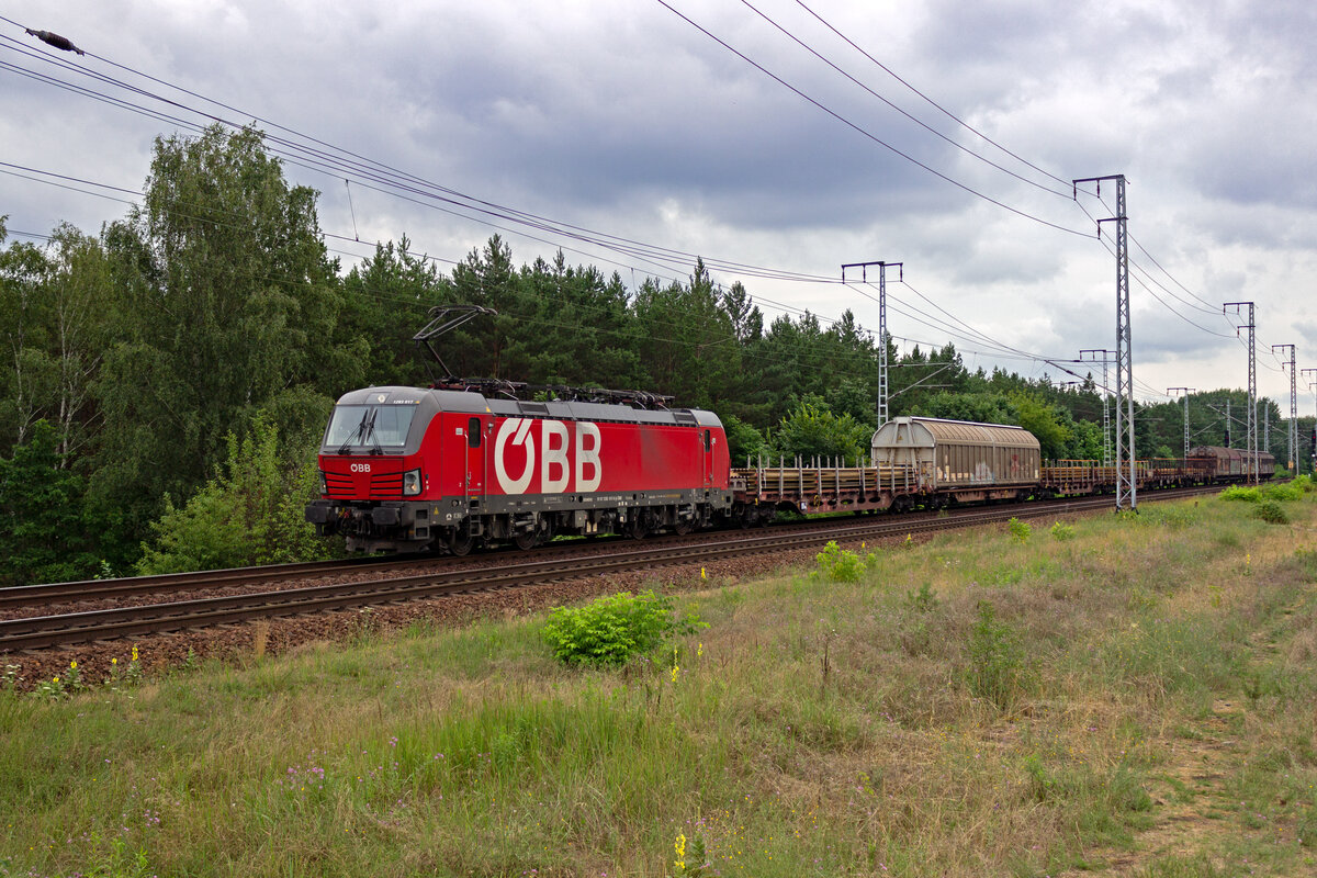 Zeitgleich mit einem in Richtung Süden fahrenden leeren Güterzug durchfährt 1293 004 Köln-Süd. Aufgrund der leeren Containertragwagen war zumindest ein halbwegs brauchbares Foto möglich.