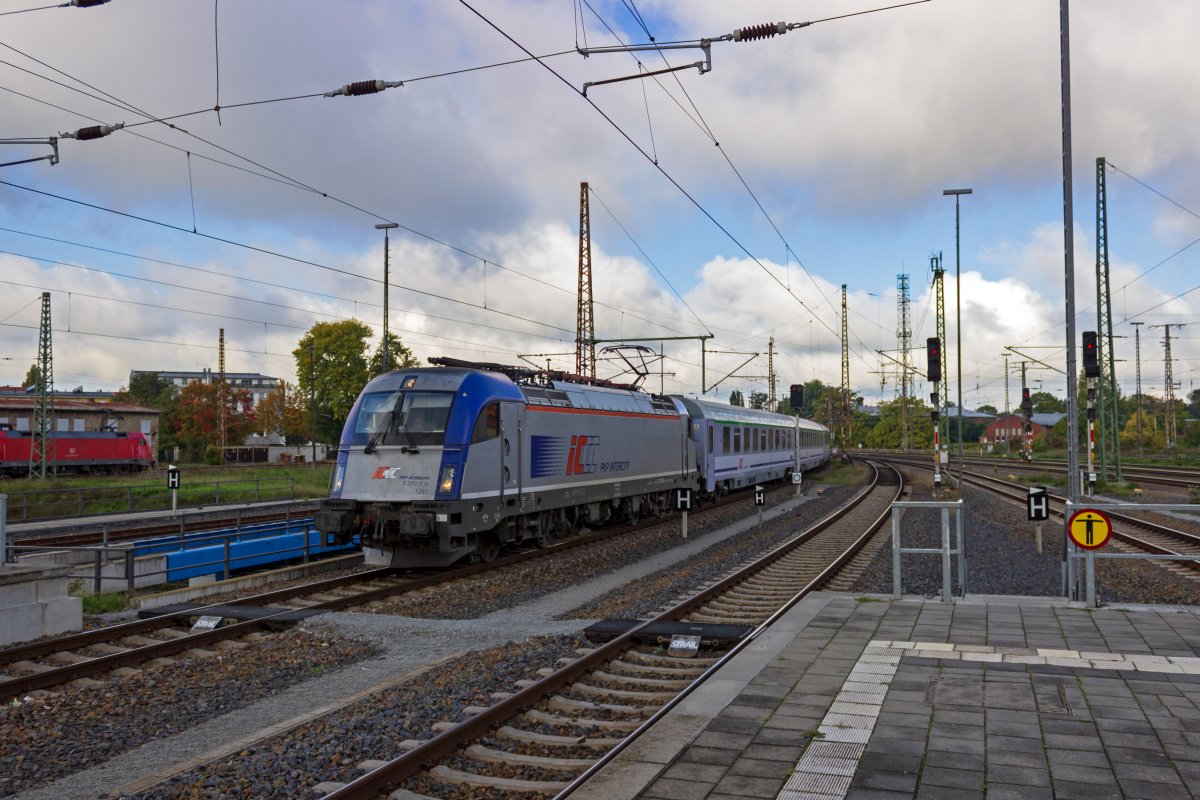 Unerwartet schnell (da ist wohl 160...) war 5370 005 mit dem EuroCity nach Berlin (Hauptbahnhof oder Lichtenberg, weiß ich nicht genau) unterwegs, sodass ich lieber ne Sekunde früher abdrückte, als die völlig bewegungsunscharf zentral zu platzieren. So hängt dann halt der Pantograph in der Brücke. Erkner, 9.10.13