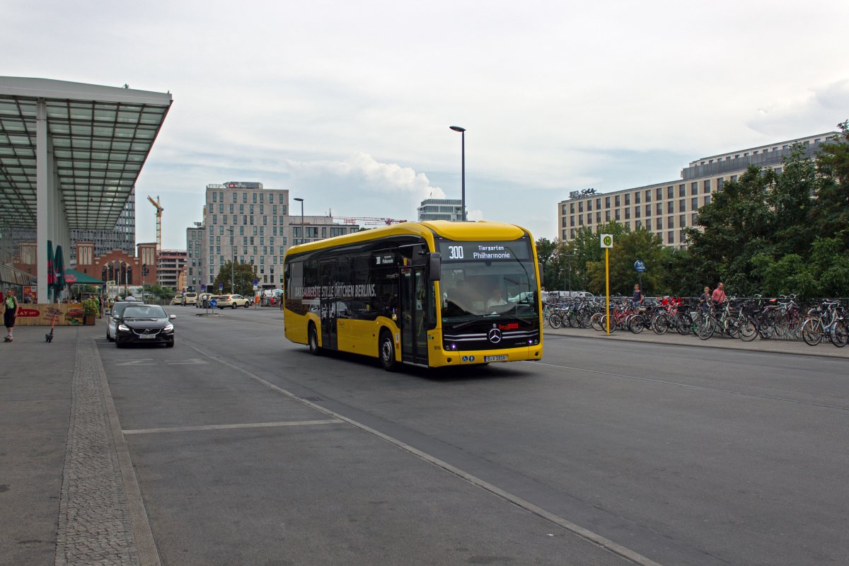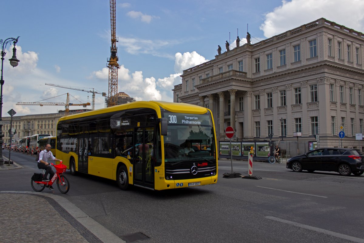 Seit einer Umstrukturierung des Busnetzes in der Berliner Innenstadt gibt es eine neue Linie 300, die überwiegend mit Elektrobussen bedient wird. eCitaro 1819 fährt hier an der mittlerweile fast fertiggestellten Fassade des Berliner Schlosses vorbei.