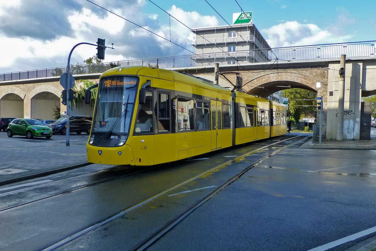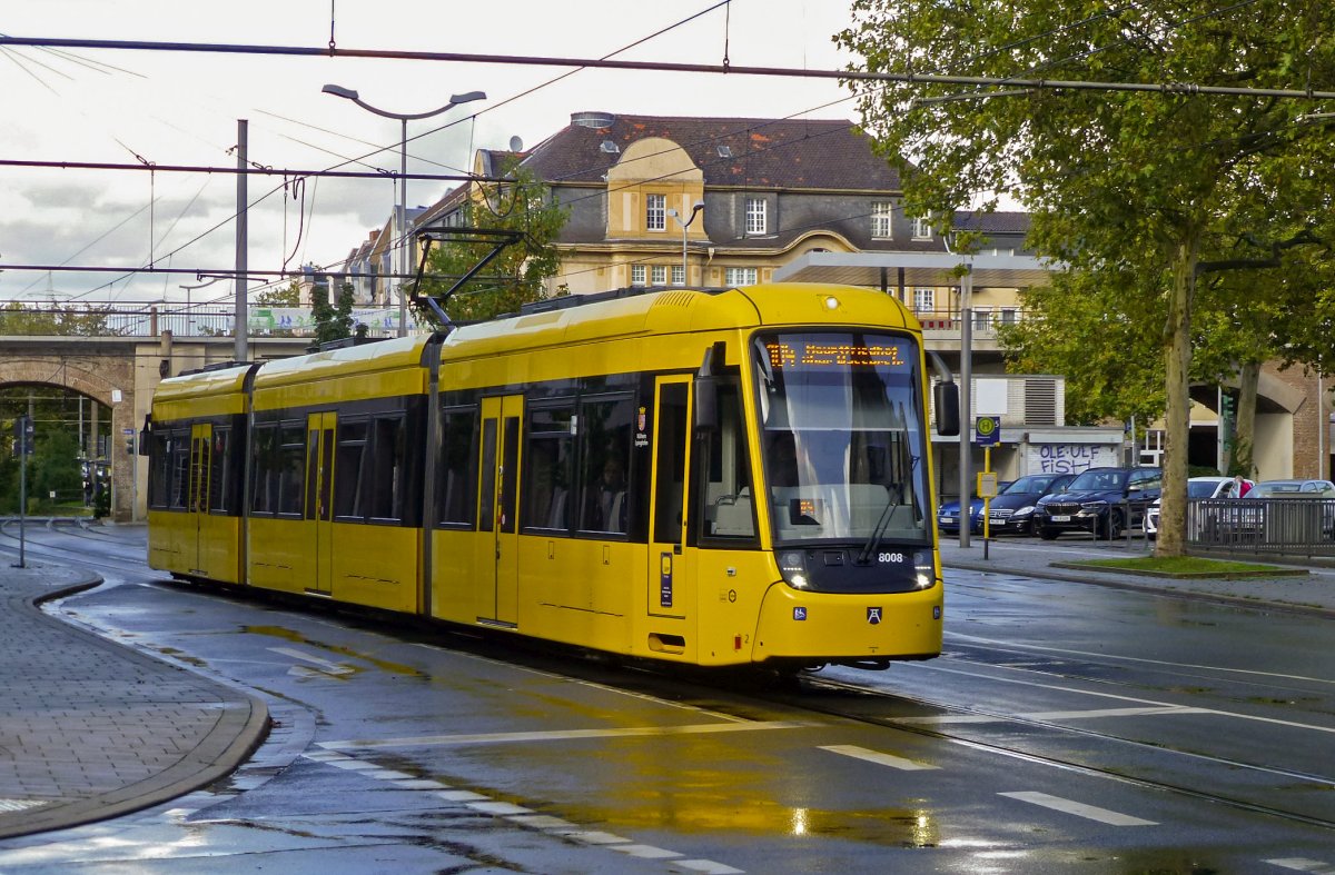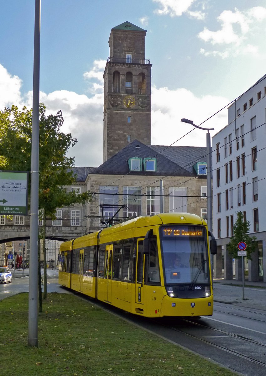 An der zentralen Umsteigestation Stadtmitte treffen sich die zwei Generationen Mülheimer Niederflurstraßenbahnen. Links ein MGT6D aus den 1990er-Jahren im grünen Farbschema der Oberhausener STOAG und rechts ein Bombardier Flexity, der den aktuellsten Stand des schienengebundenen Nahverkehrs im Ruhrgebiet darstellt.