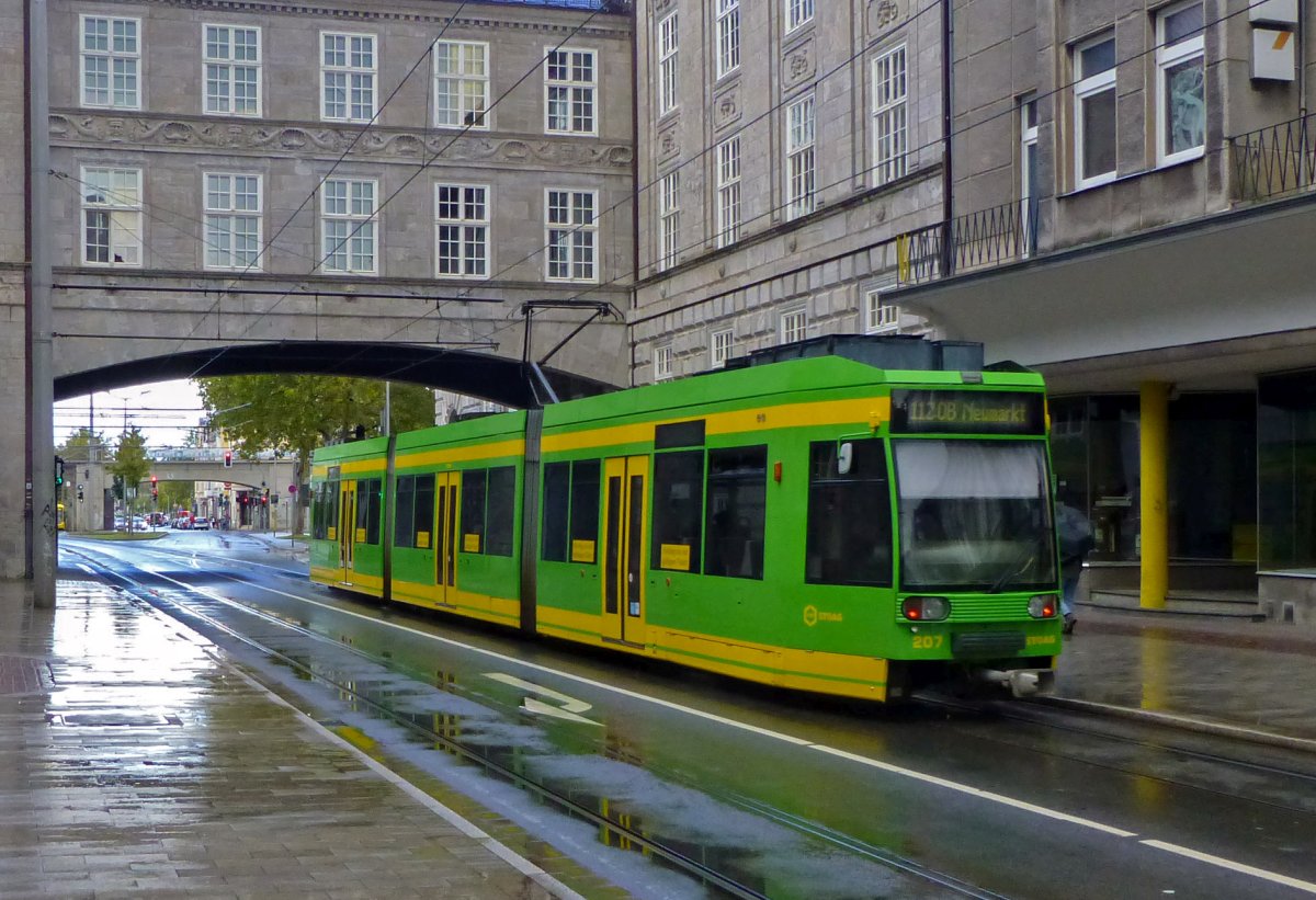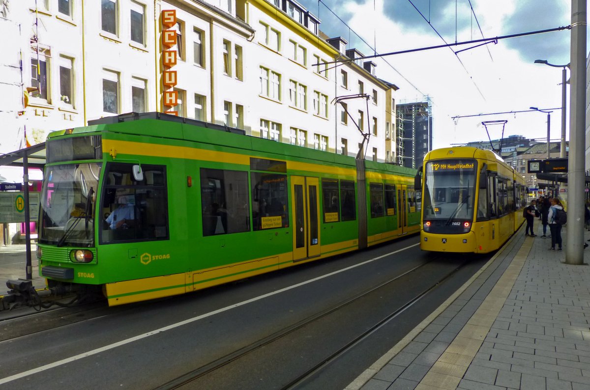 Die Mülheimer Straßenbahn steht immer wieder auf der Kippe. Derzeit haben sich die drei verbliebenen Linien aber behaupten können und Wagen 208 fährt friedlich am Bus 1565 vorbei.