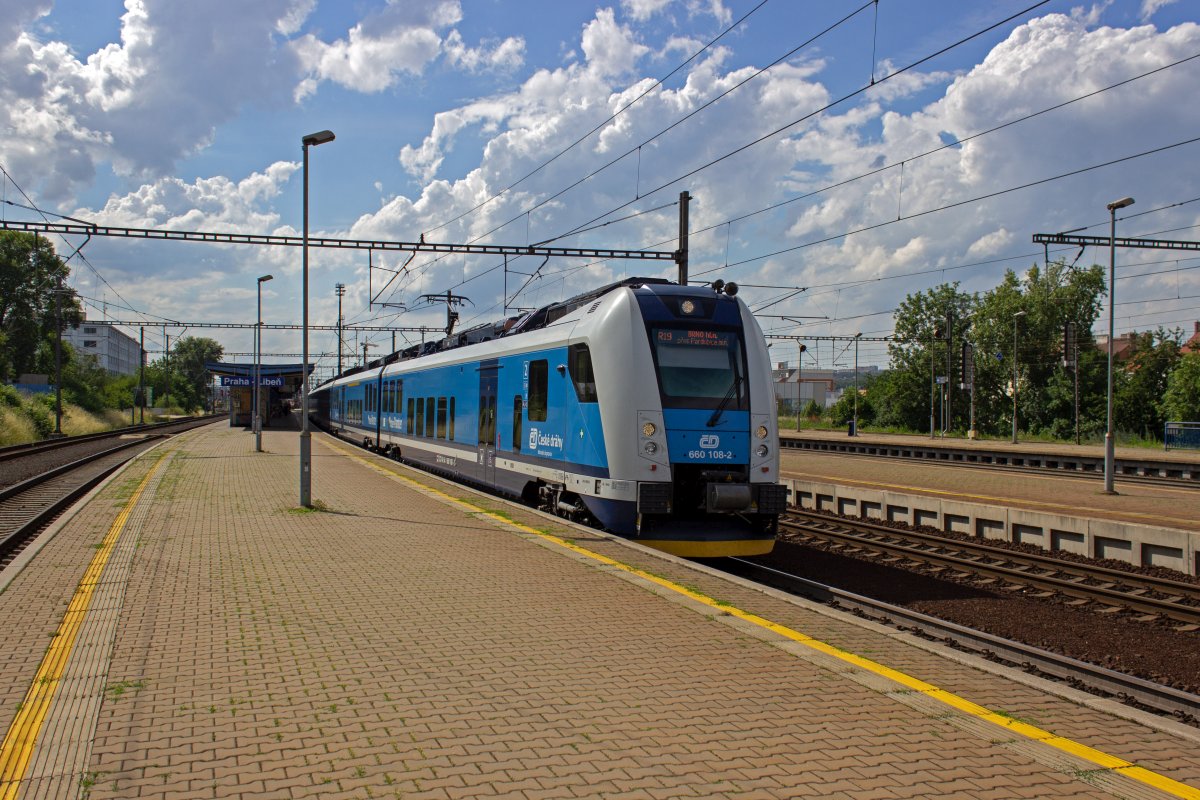 Nach und nach kommen auch in Tschechien mehr moderne Triebwagen zum Einsatz. Das betrifft vor allem die Rychlík (Schnellzüge), die zu einem großen Teil aus Personenwagen gebildet werden, die bereits mehrere Jahrzehnte im Einsatz sind. So wird die Linie R19 von Prag nach Brno seit einiger Zeit mit "InterPanter"-Triebwagen der Baureihe 660 bedient. Hier durchfährt 660 106 Praha-Běchovice auf dem Weg nach Smíchov.